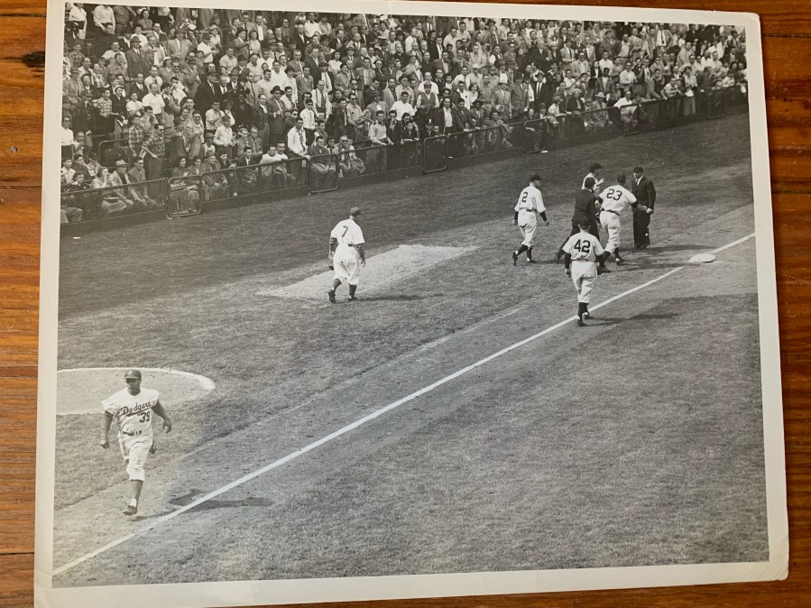 When looking at our photograph, I can tell that the play started with runners on first and third base. The batter hit the ball to the shortstop, who flipped the ball to the second baseman for what was probably a double play. Using Baseball-Reference.com, I searched the play-by-play records for the first two games of the World Series to identify a matching situation. Runners on first and third, and a 6-4-3 double play by the visiting team. I found nothing! Coming up blank, I started to look more closely at the players and their uniform numbers.