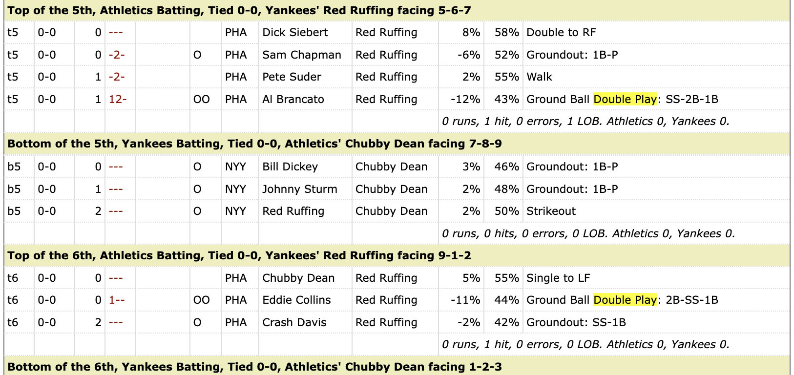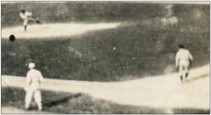 The double play hit by Brancato is interesting because Pete Suder is the runner on first base. However, according to this play-by-play, Dick Siebert is on second base, and we are looking for a runner on third base. Could Siebert really have run from second base almost all the way to home plate as shown in our photograph? Even with a running start, could Siebert have gone that far?