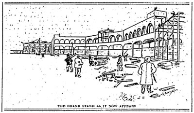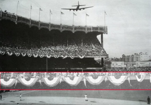 This photograph shows a well-known incident that occurred during Game 1 of the 1943 World Series when a plane flew over Yankee Stadium. Overlayed with the red border is the bunting from our photograph. The bunting in our photograph includes pennants with stars and stripes hanging down, whereas the bunting in the 1943 photograph does not. So our photograph is probably not from 1943.