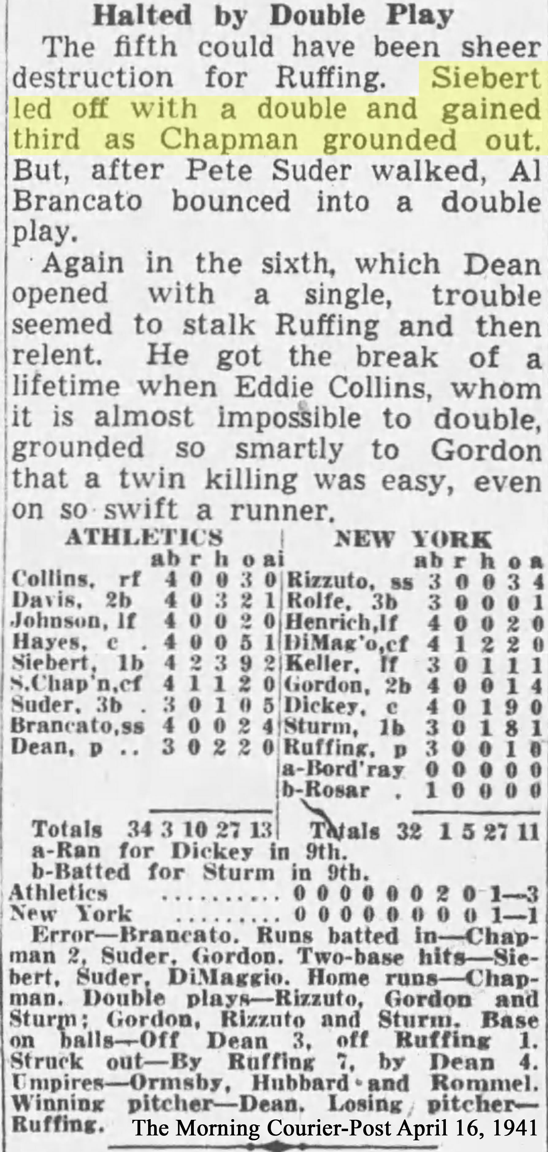 Looking back at Baseball-Reference for the play-by-play of the 1941 New York Yankees home opener, we find the Athletics hit into two double plays. One by Al Brancato in the Top of the 5th inning and one by Eddie Collins Jr. in the top of the 6th inning.