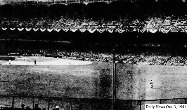 I started looking to see if I could find images of the Yankee Stadium bunting for other World Series of that era. After examining photographs from several World Series in which the Yankees participated, I was able to rule out 1939, 1942, and 1943 based on the bunting. This photograph from the October 3, 1941, Daily News proved to be a match to the bunting from our photograph. So our photograph has to be from the 1941 World Series, right? Well no. Let’s see how that was determined.