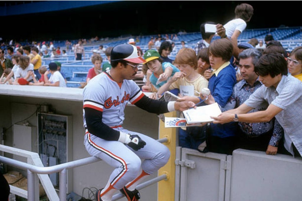 The photograph taken between May 14-16, slightly less than two weeks into his time with the Orioles, shows how uncomfortable he appears in his new uniform. Sitting on the railing, he keeps his distance instead of standing at the wall to engage with the fans. His blank emotions and limp body language show his interest in signing autographs.
